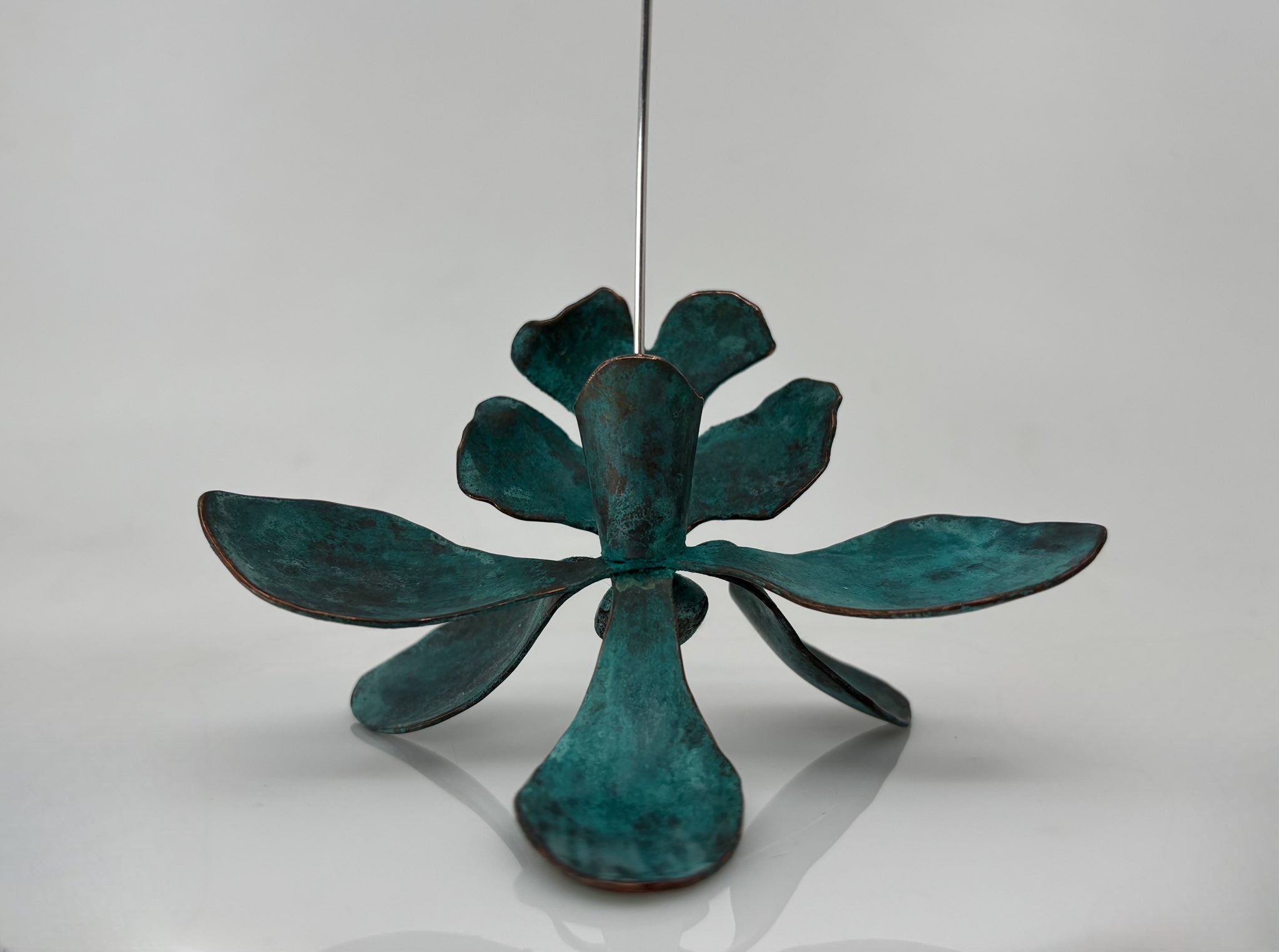Made with copper and brass, with green patina. An incense burner for my dad, who is very supportive of my art endeavors, and collects incense burners. Growing up we used these as a way to relax, incense is tied to a very calming memory.